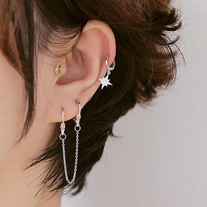 Entdecken Sie stilvolle Vielseitigkeit mit unserem 1 Creole Ohrring für zwei Ohrlöcher mit Kette in Silber 925. Durch das innovative Design können Sie zwei Ohrringe in einem tragen und damit...