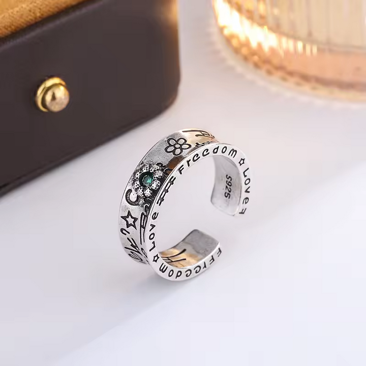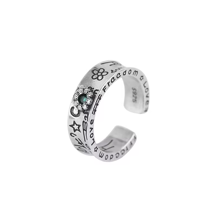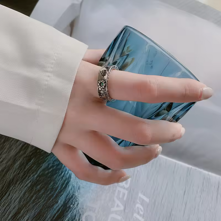 Damen Blumen Ring Sterling-Silber 925 mit grüner Zirkonia, geschwärzt, offen