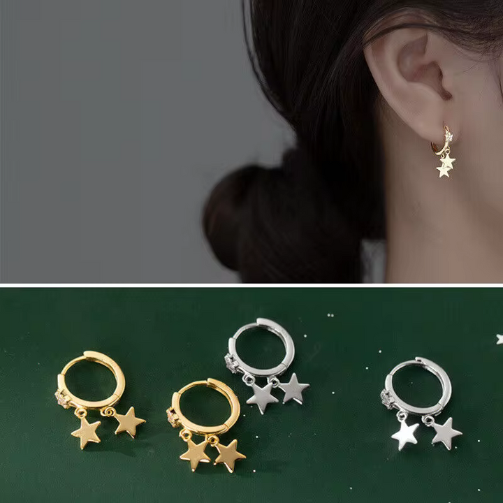 Verleihe deinem Look einen Hauch von Magie mit diesen wunderschönen Creolen aus 925er Silber. Die feinen Ohrringe sind mit zwei filigranen Sternanhängern verziert und in klassischem Silber oder edlem Gold erhältlich. Perfekt für jeden Anlass – ob Alltag oder besondere Events. Dank hochwertigem 925 Silber sind sie langlebig, hautfreundlich und angenehm zu tragen.