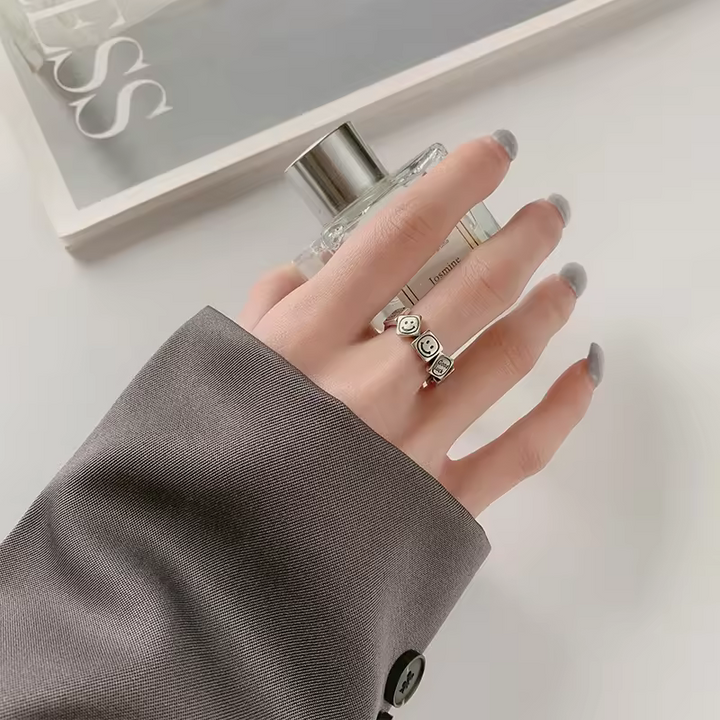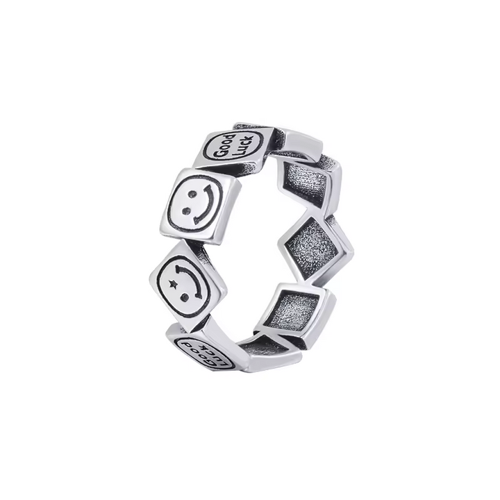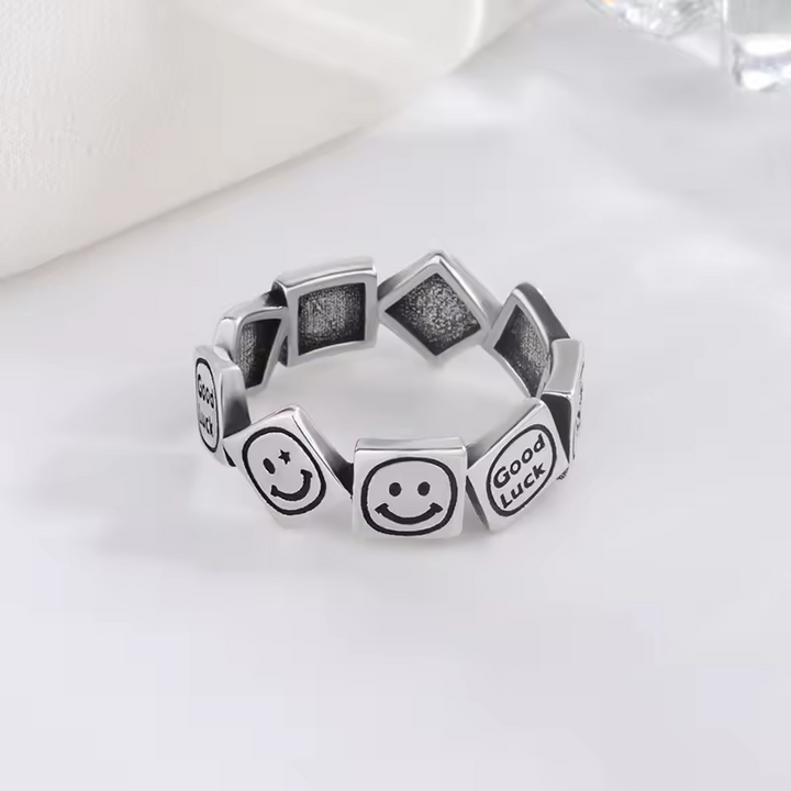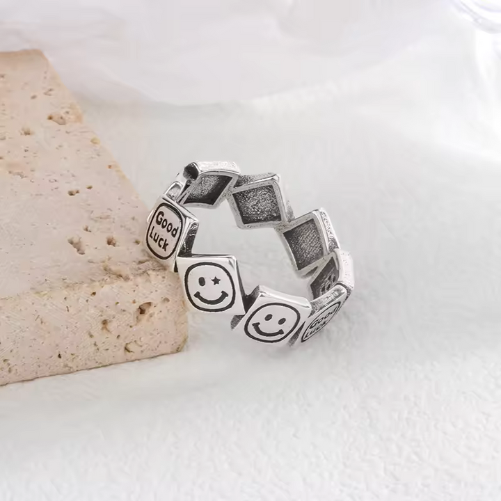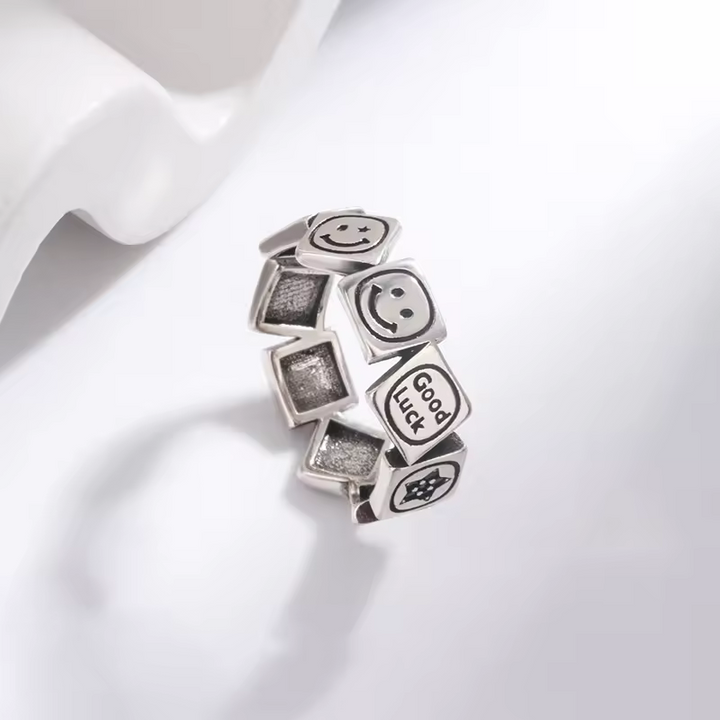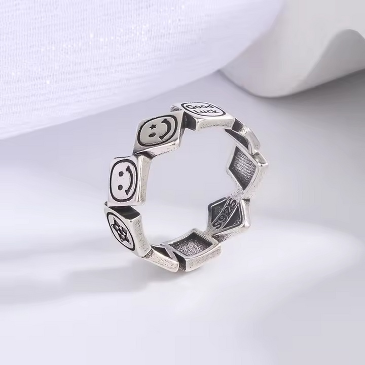 Damen Ring Lachen-Motiv Sterling-Silber 925, Viel Glück Schwarz offene Größe.