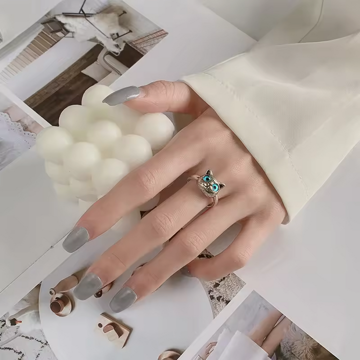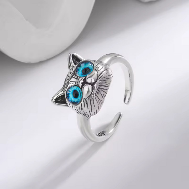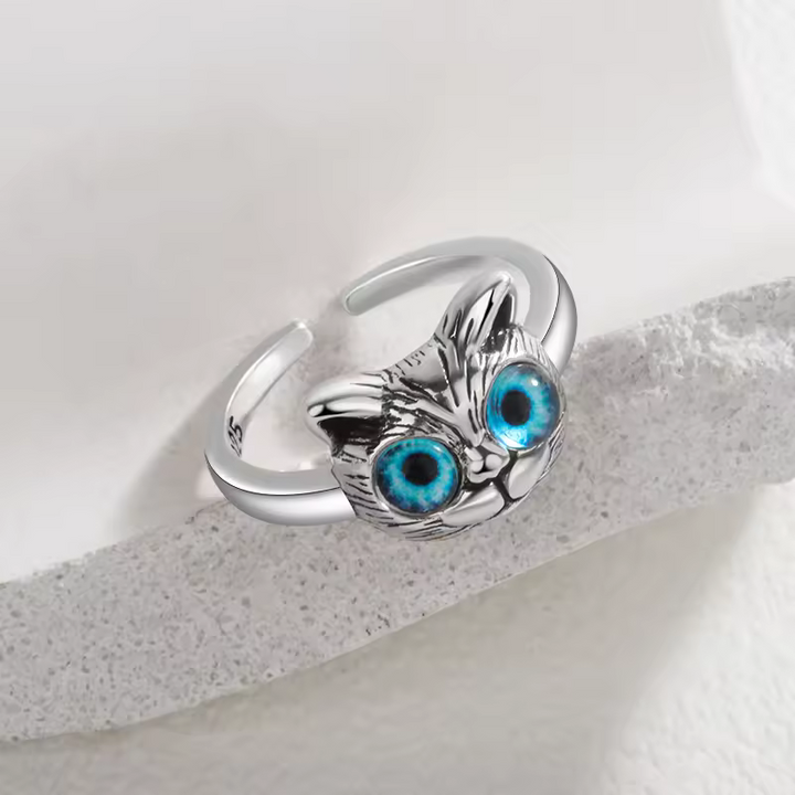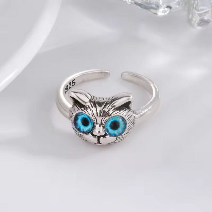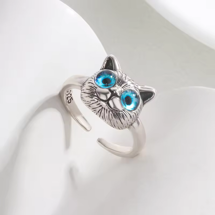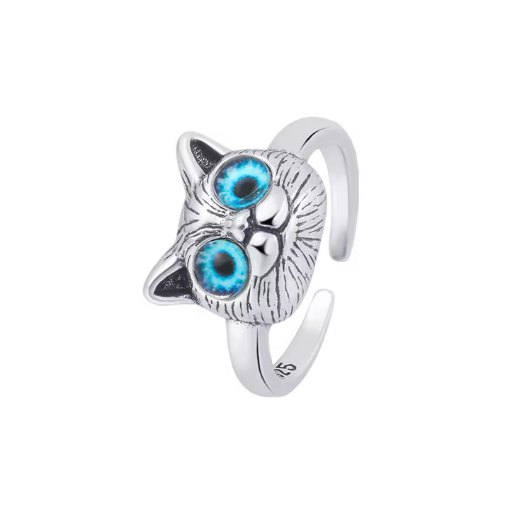 Damen Ring mit Katzen motiv und blauen Augen, Sterling Silber 925, größenverstellbar
