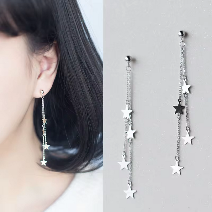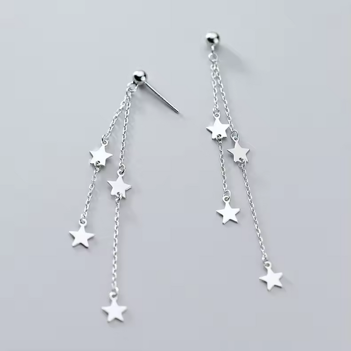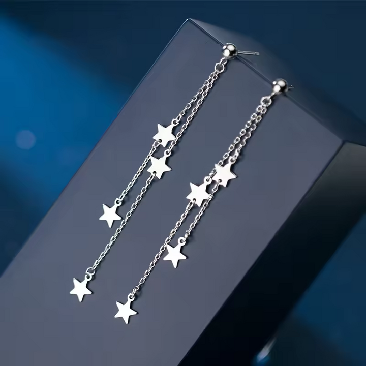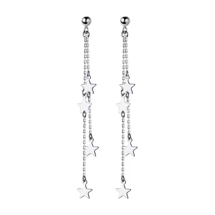 Damenohrringe mit Kette und Stern-Anhängern, Silber 925, Ohrhänger.