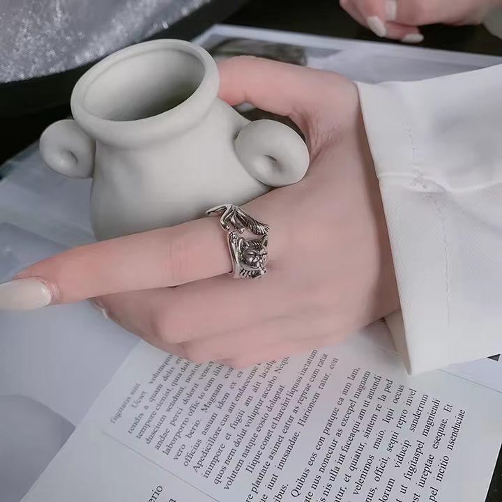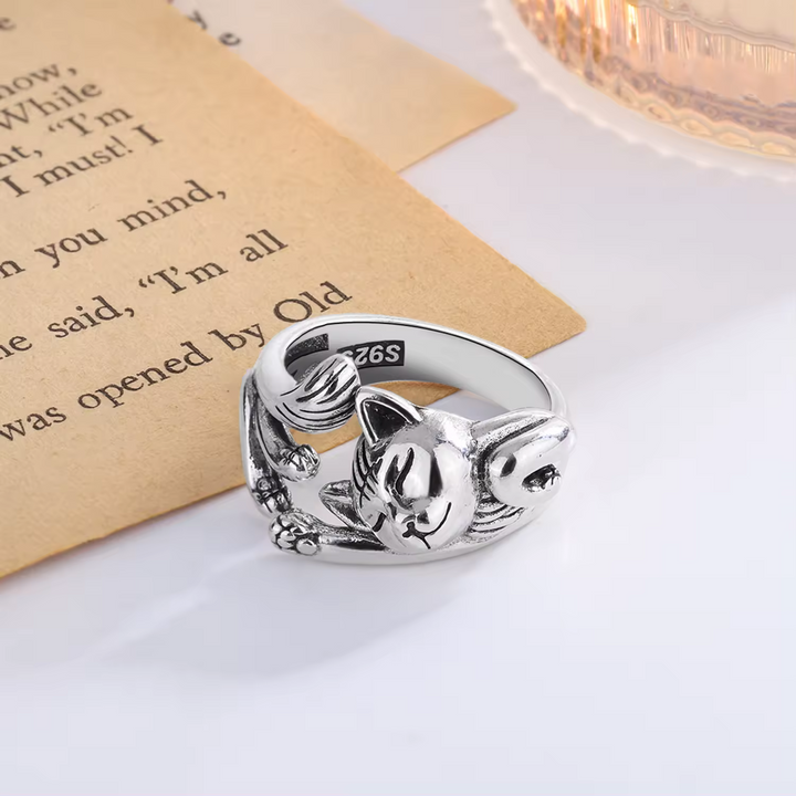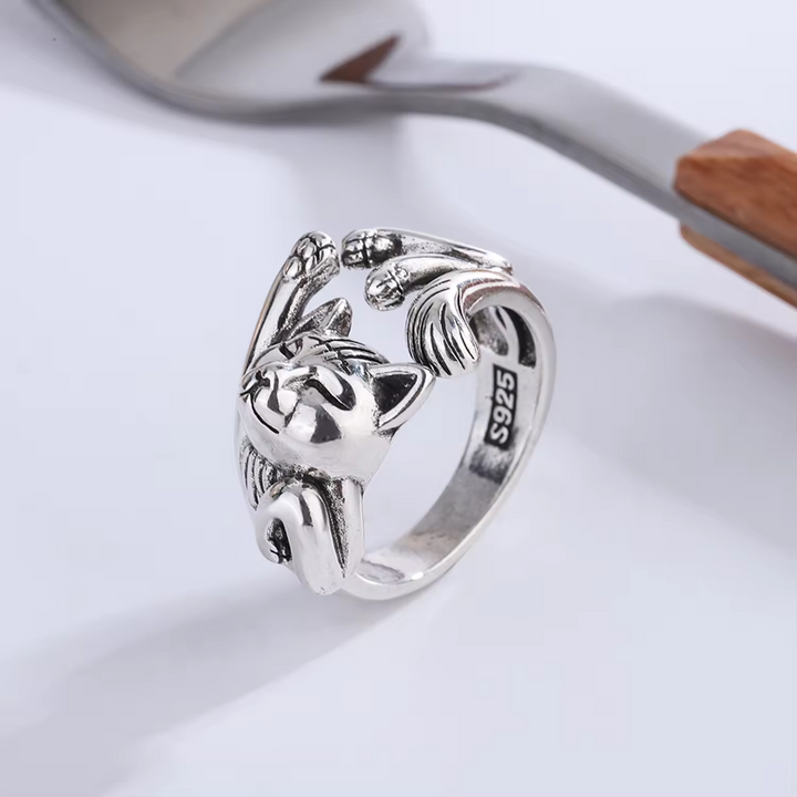 Damenring Glücks katzen ring, Silber 925, geschwärzt, größenverstellbar 48-55