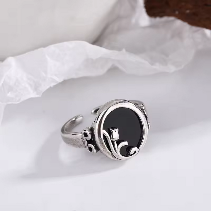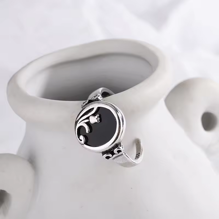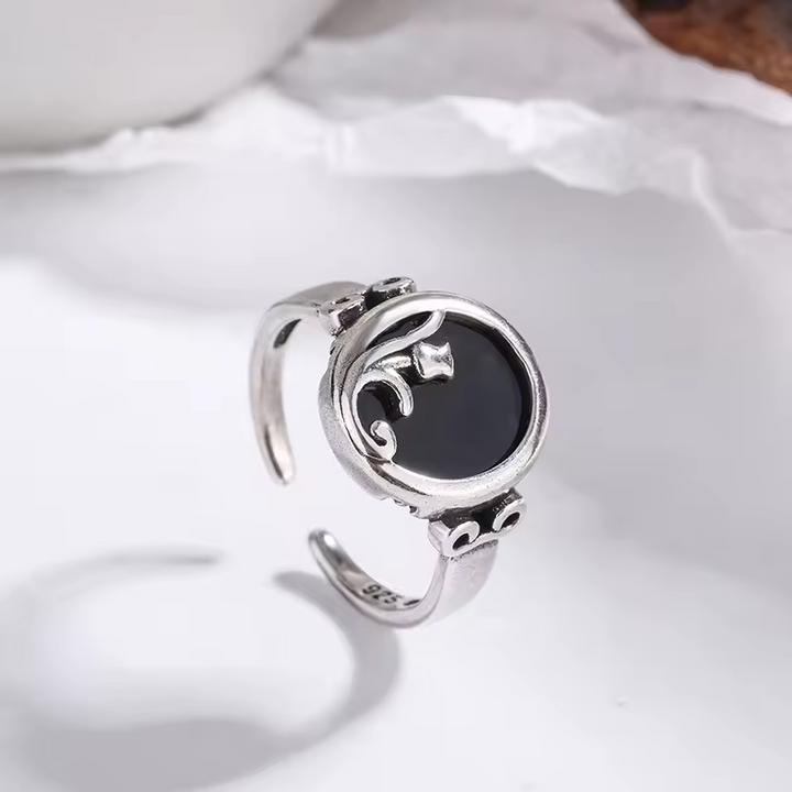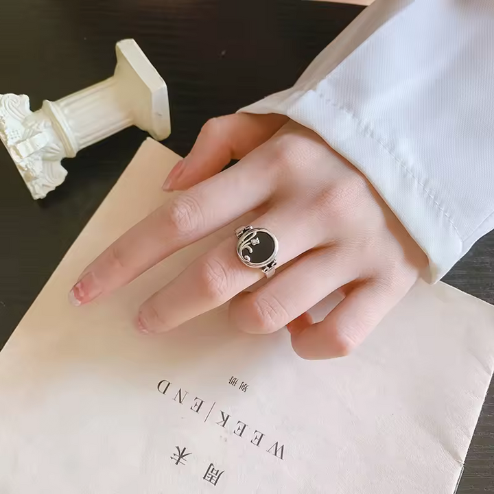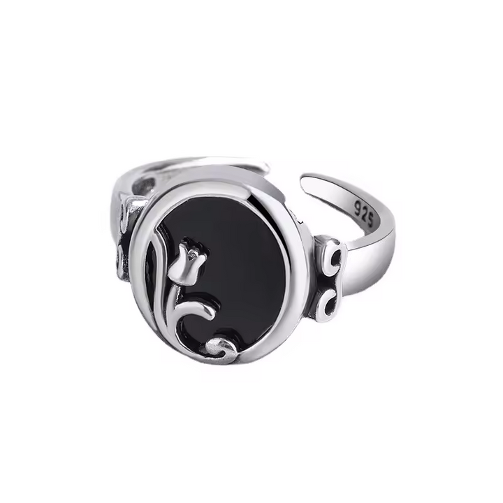 Damenring in rose motiv mit schwarzem Zirkonia, größenverstellbar