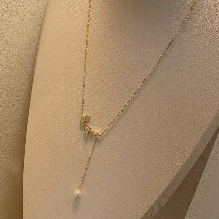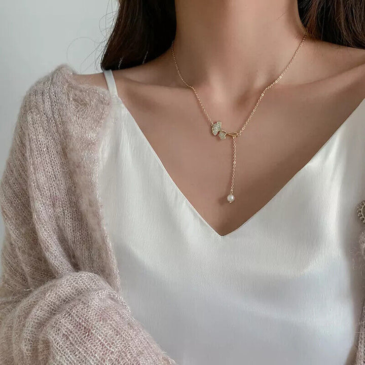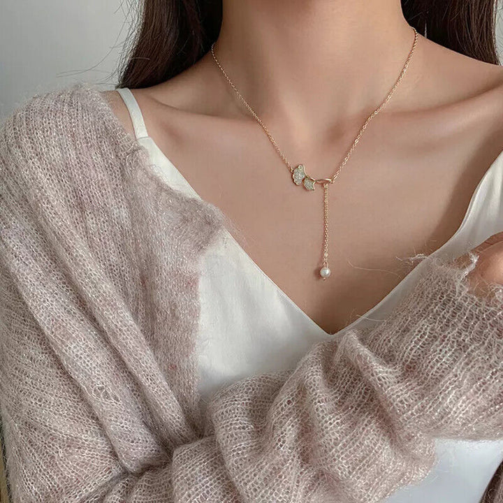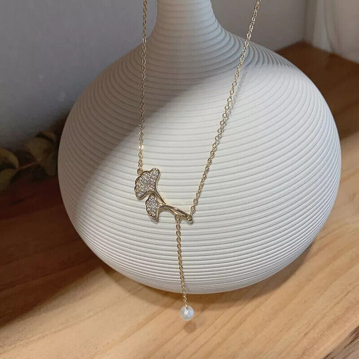 Halskette Ginkgo Blatt Sterling Silber 925 mit Perle Damen Goldn Collier