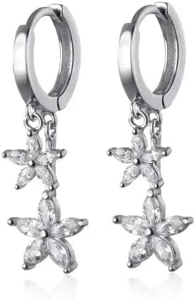 Creolen Ohrringe Damen 925 Silber – Hängeohrringe mit Zirkonia in Blumenform, 35 mm Länge, elegantes Design, Schnappverschluss, Silberfarben
