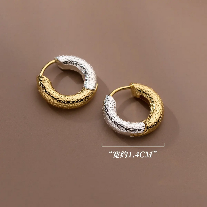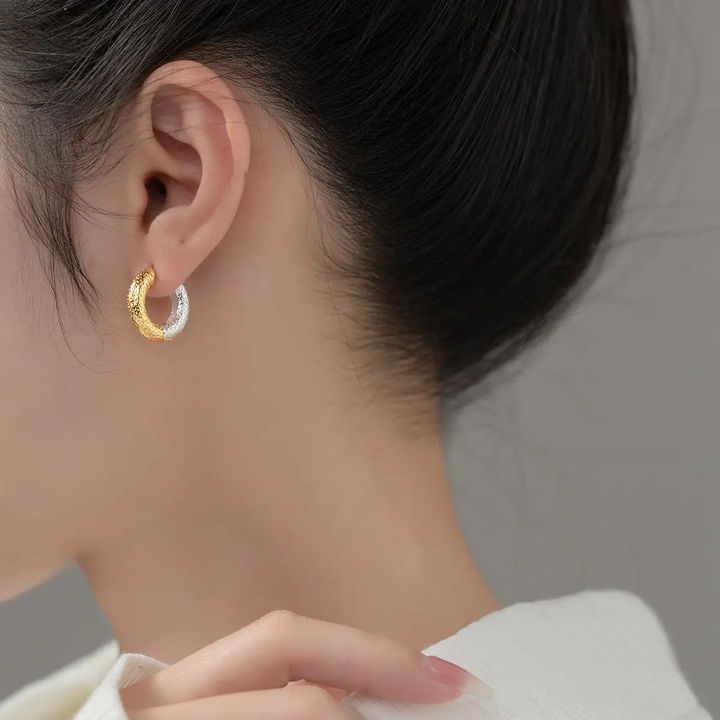 Retro Look Kreolen Silber 925 – Zweifarbige Struktur-Ohrringe in Gold & Silber