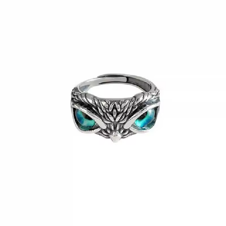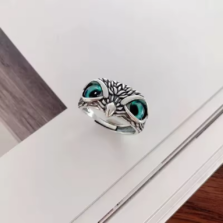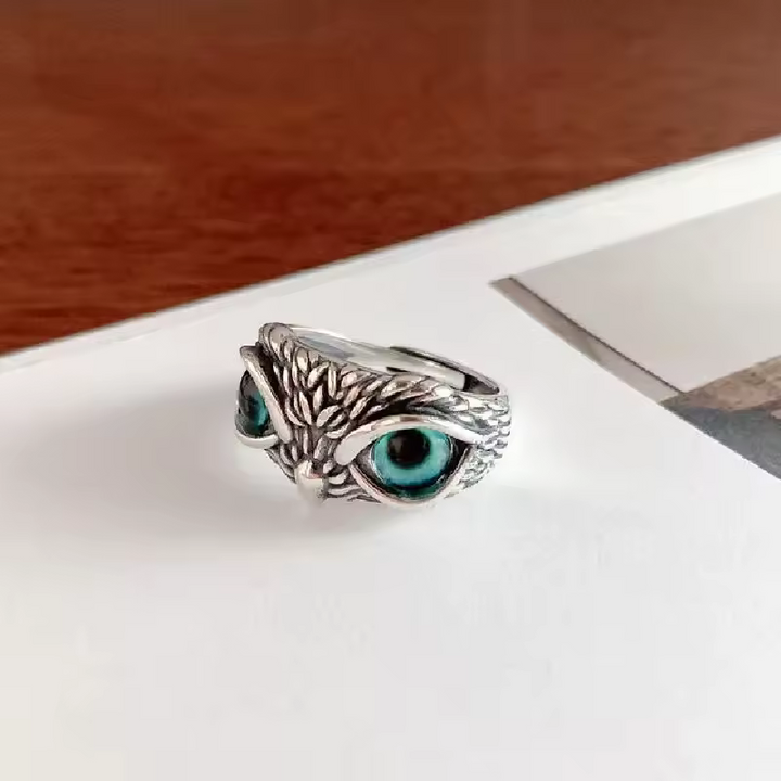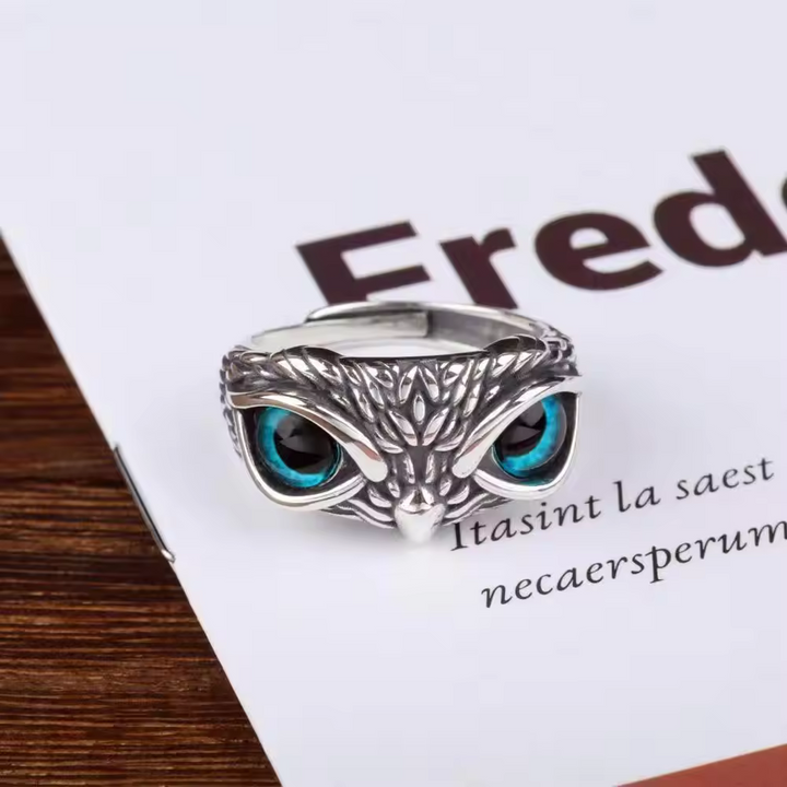 Ring mit Eulenmotiv, Silber, geschwärzt mit blauen Augen, Größe wählbar