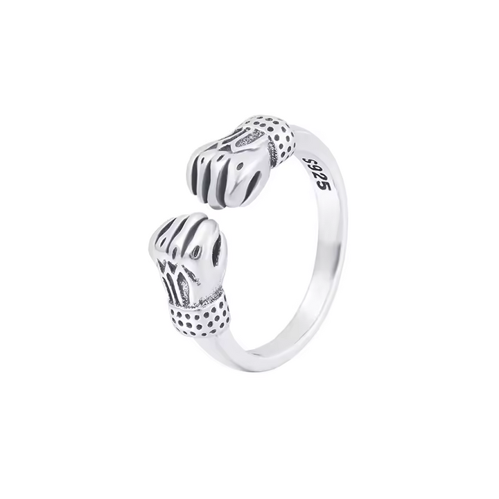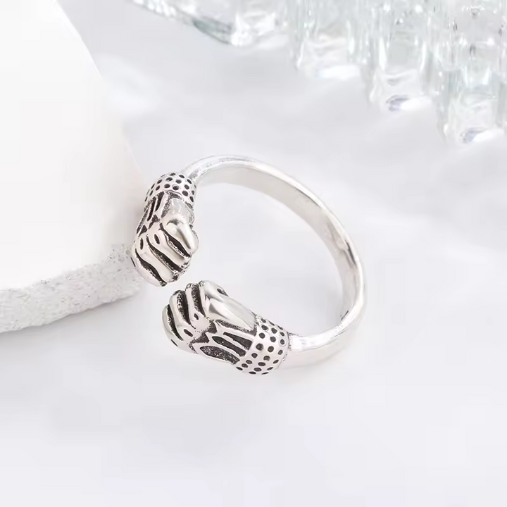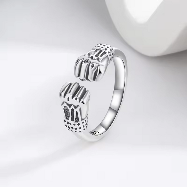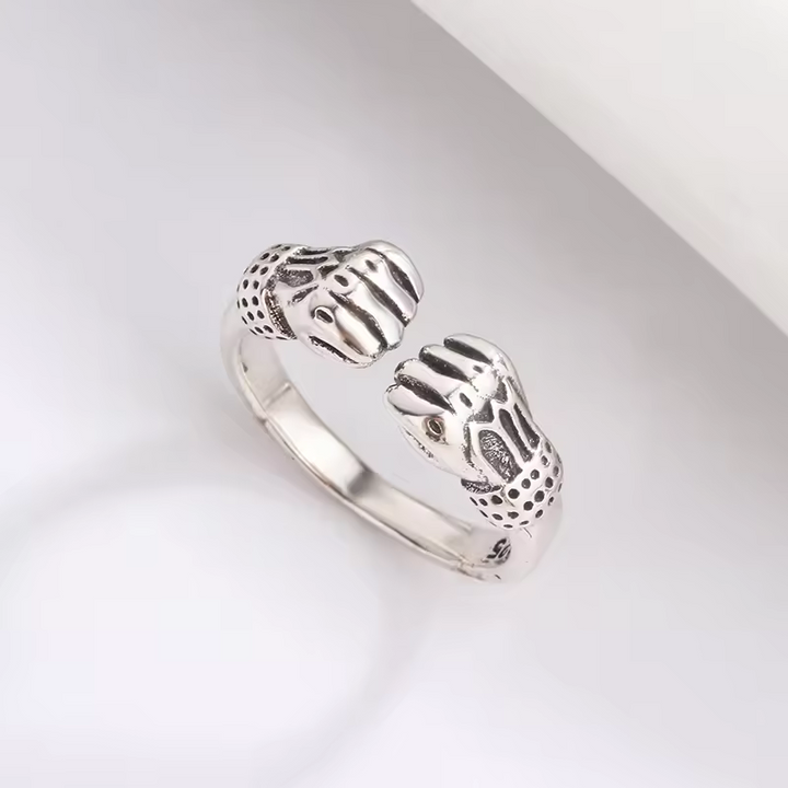 Ring mit Hände-Motiv-Box Silber 925er, leicht geschwärzt und größenverstellbar.